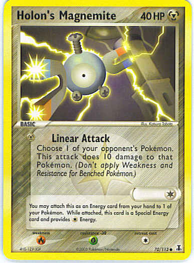 | Type | Metal | | Pokemon serie | Delta Species | | Stadie | Basic | | HP | 40 | | Sjældenhed | Common | | Tilbagetrækning | 1 | | Modstand | G | | Svaghed | F | | Kortnummer | 70 | | Evne | [M] Linear Attack - Choose 1 of your opponent's Pokemon. This attack does 10 damage to that Pokemon. (Don't apply Weakness and Resistance for Benched Pokemon.) You may attach this as an Energy card from your hand to 1 of your Pokemon. While attached, this card is a Special Energy card and provides 1 C Energy. | | Evne2 | [M] Linear Attack - Choose 1 of your opponent's Pokemon. This attack does 10 damage to that Pokemon. (Don't apply Weakness and Resistance for Benched Pokemon.) You may attach this as an Energy card from your hand to 1 of your Pokemon. While attached, this card is a Special Energy card and provides 1 C Energy. | | Kunstner | Katsura Tabata |