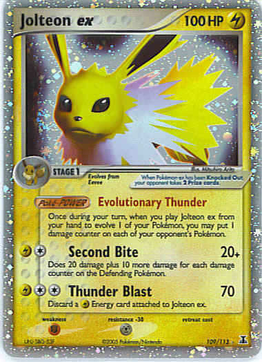 | Type | Lightning | | Pokemon serie | Delta Species | | Stadie | Stage 1 | | HP | 100 | | Sjældenhed | Ultra-Rare | | Modstand | M | | Svaghed | F | | Kortnummer | 109 | | Evne | [CL] Second Bite (20+) Does 20 damage plus 10 more damage for each damage counter on the Defending Pokemon. [CCL] Thunder Blast (70) Discard a L Energy card attached to Jolteon EX. | | Evne2 | [CL] Second Bite (20+) Does 20 damage plus 10 more damage for each damage counter on the Defending Pokemon. [CCL] Thunder Blast (70) Discard a L Energy card attached to Jolteon EX. | | Kunstner | Mitsuhiro Arita |