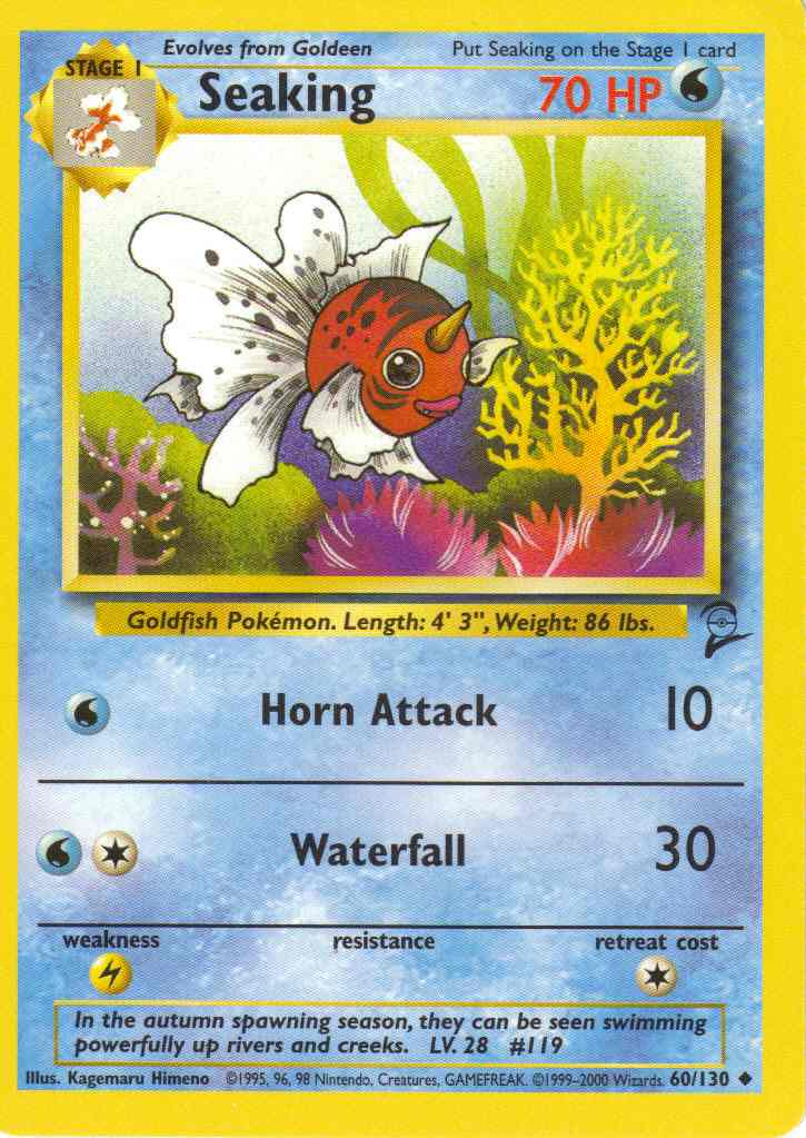 | Type | Water | | Pokemon serie | Base Set 2 | | Stadie | Stage 1 | | HP | 70 | | Sjældenhed | Uncommon | | Tilbagetrækning | 1 | | Svaghed | L | | Kortnummer | 60 | | Evne |