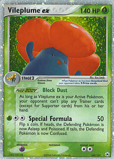 | Type | Grass | | Pokemon serie | Hidden Legends | | Stadie | Stage 2 | | HP | 140 | | Sjældenhed | Ultra-Rare | | Tilbagetrækning | 2 | | Svaghed | P | | Kortnummer | 100 | | Evne | [CCG] Special Formula (50) Flip a coin. If heads, the Defending Pokemon is now Asleep and Poisoned. If tails, the Defending Pokemon is now Confused. | | Evne2 | [CCG] Special Formula (50) Flip a coin. If heads, the Defending Pokemon is now Asleep and Poisoned. If tails, the Defending Pokemon is now Confused. | | Kunstner | Ryo Ueda |