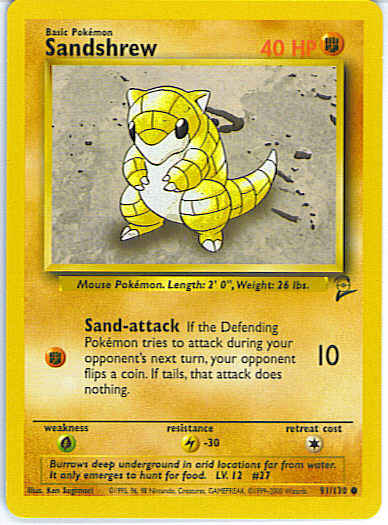 [F] Sand-attack (10) If the Defending Pokemon tries to attack during your opponent's next turn, your opponent flips a coin. If tails, this attack does nothing.