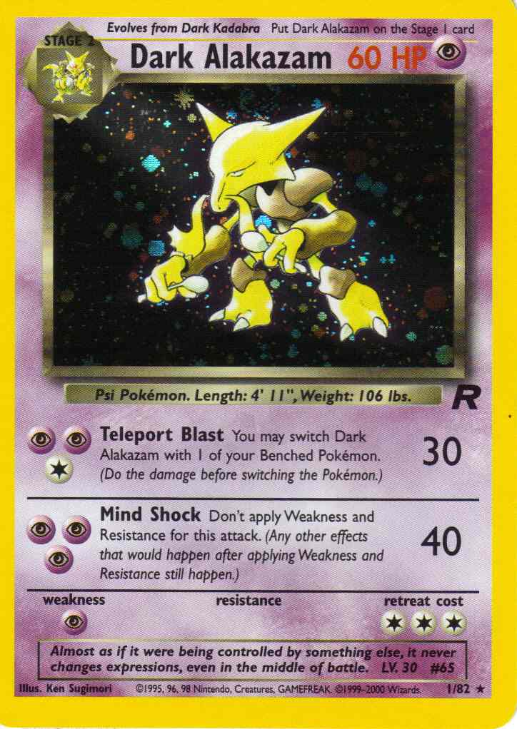 | Type | Psychic | | Pokemon serie | Team Rocket | | Stadie | Stage 2 | | HP | 60 | | Sjældenhed | Rare | | Tilbagetrækning | 3 | | Svaghed | P | | Kortnummer | 1 | | Evne |