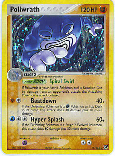| Type | Fighting | | Pokemon serie | Unseen Forces | | Stadie | Stage 2 | | HP | 120 | | Sjældenhed | Rare | | Tilbagetrækning | 2 | | Svaghed | P | | Kortnummer | 11 | | Evne |