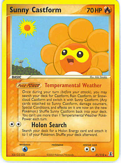 | Type | Fire | | Pokemon serie | Delta Species | | Stadie | Basic | | HP | 70 | | Sjældenhed | Rare | | Tilbagetrækning | 2 | | Svaghed | W | | Kortnummer | 31 | | Evne | on it are now on the new Pokemon.) Shuffle Sunny Castform back into your deck. You can't use more than 1 Temperamental Weather Poke-Power each turn. (Poke-POWER)
