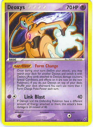 | Type | Psychic | | Pokemon serie | Deoxys | | Stadie | Basic | | HP | 70 | | Sjældenhed | Rare | | Tilbagetrækning | 1 | | Svaghed | P | | Kortnummer | 16 | | Evne | on it are now on the new Pokemon.) If you do, put Deoxys on top of your deck. Shuffle your deck afterward. You can't use more than 1 Form Change Poke-Power each turn. (Poke-POWER)