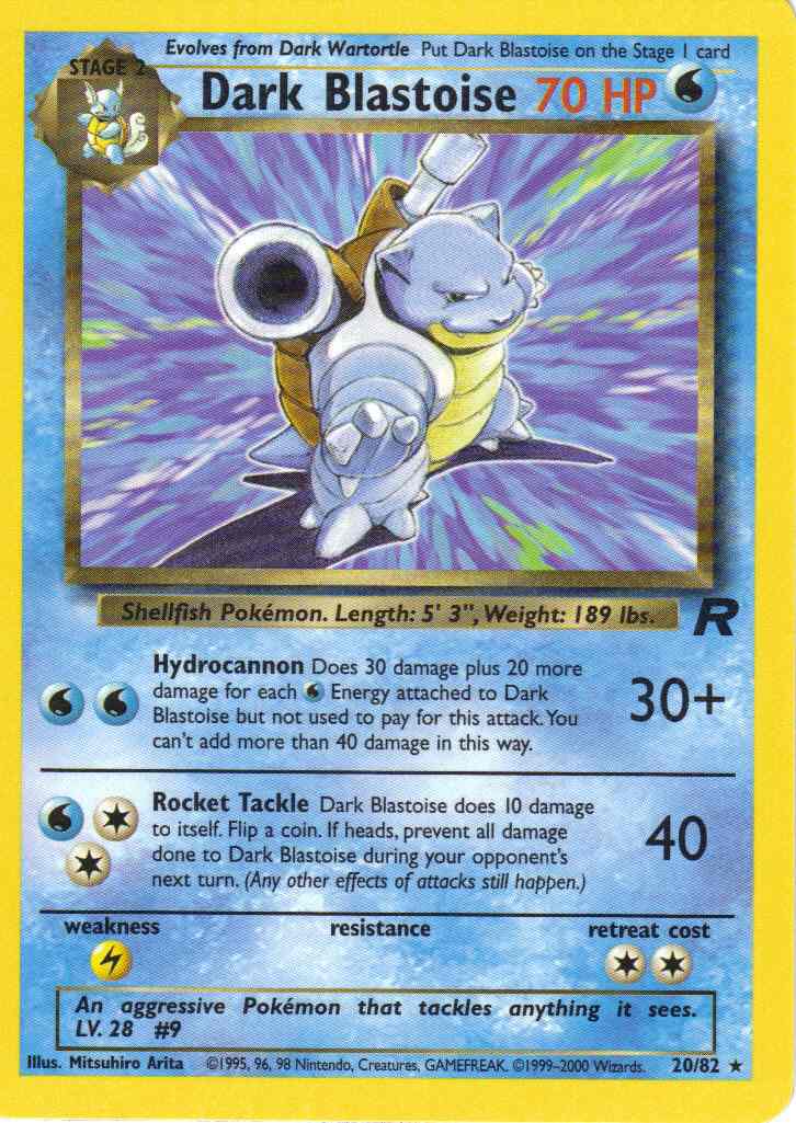 [WW] Hydrocannon (30+) Does 30 damage plus 20 more damage for each W Energy attached to Dark Blastoise but not used to pay for this attack. You can't add more than 40 damage in this way.