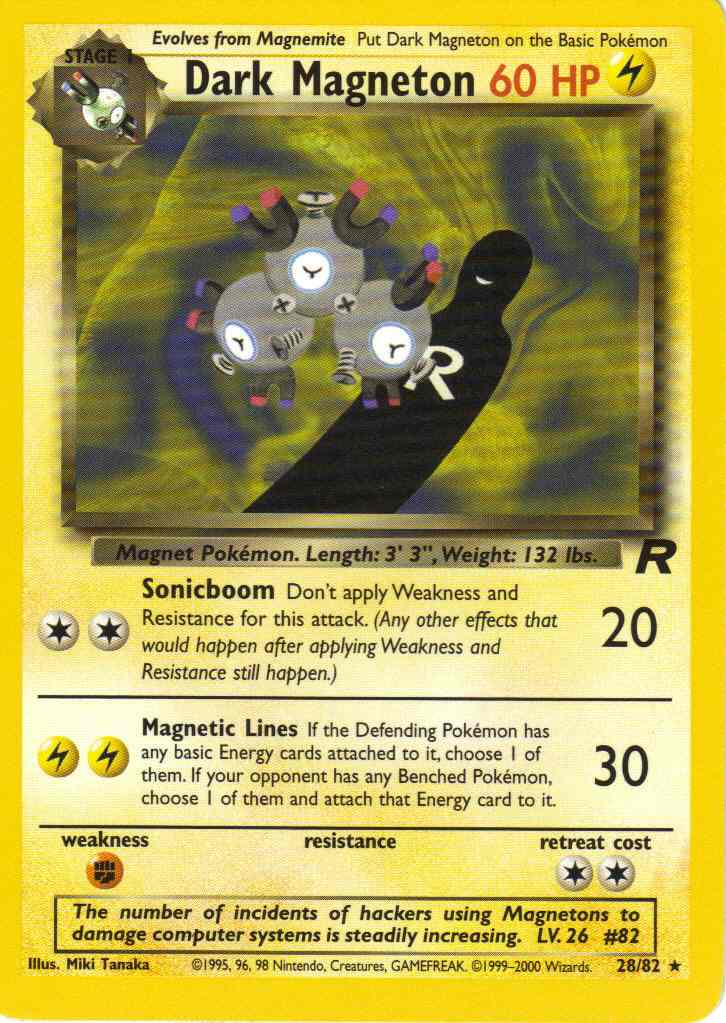 | Type | Lightning | | Pokemon serie | Team Rocket | | Stadie | Stage 1 | | HP | 60 | | Sjældenhed | Rare | | Tilbagetrækning | 2 | | Svaghed | F | | Kortnummer | 28 | | Evne |