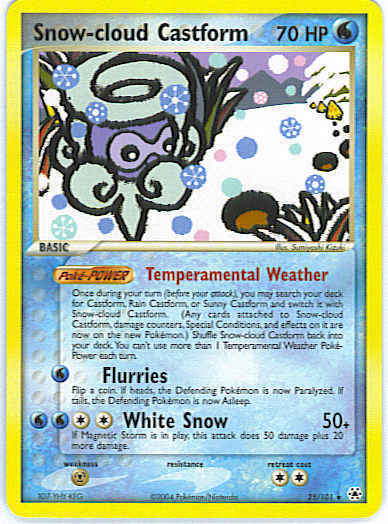| Type | Water | | Pokemon serie | Hidden Legends | | Stadie | Basic | | HP | 70 | | Sjældenhed | Rare | | Tilbagetrækning | 2 | | Svaghed | M | | Kortnummer | 25 | | Evne | on it are now on the new Pokemon.) Shuffle Snow-cloud Castform back into your deck. You can't use more than 1 Temperamental Weather Poke-Power each turn. (Poke-POWER)