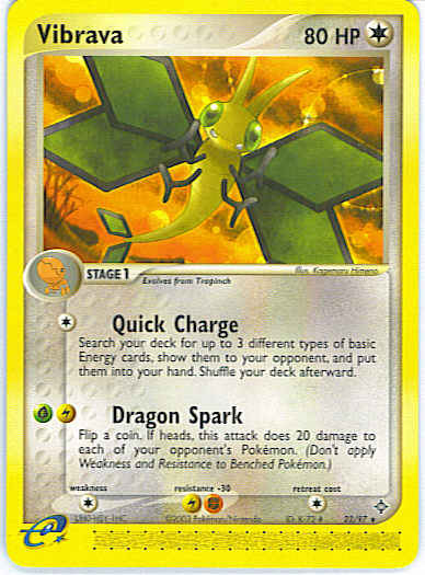 | Type | Colorless | | Pokemon serie | Dragon | | Stadie | Stage 1 | | HP | 80 | | Sjældenhed | Rare | | Tilbagetrækning | 1 | | Modstand | FL | | Svaghed | C | | Kortnummer | 22 | | Evne |