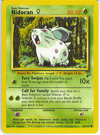 [GG] Call for Family - Search your deck for a Basic Pokemon named Nidoran M or Nidoran F and put it onto your Bench. Shuffle your deck afterward. (You can't use this attack if your Bench is full.)