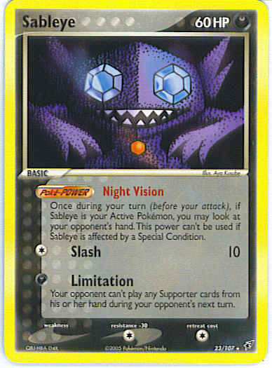 | Type | Darkness | | Pokemon serie | Deoxys | | Stadie | Basic | | HP | 60 | | Sjældenhed | Rare | | Tilbagetrækning | 1 | | Modstand | C | | Kortnummer | 23 | | Evne |