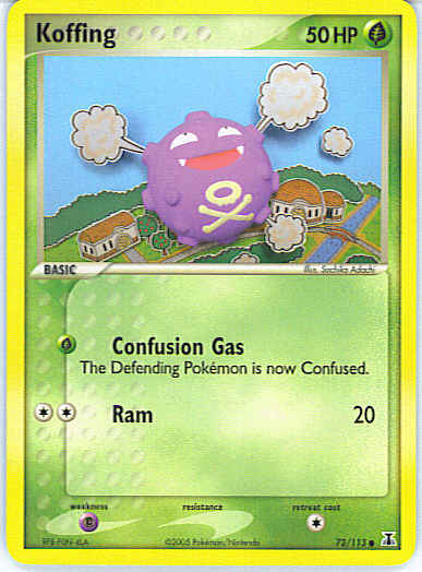 | Type | Grass | | Pokemon serie | Delta Species | | Stadie | Basic | | HP | 50 | | Sjældenhed | Common | | Tilbagetrækning | 1 | | Svaghed | P | | Kortnummer | 72 | | Evne | [G] Confusion Gas - The Defending Pokemon is now Confused. [CC] Ram (20) | | Evne2 | [G] Confusion Gas - The Defending Pokemon is now Confused. [CC] Ram (20) | | Kunstner | Sachiko Adachi |