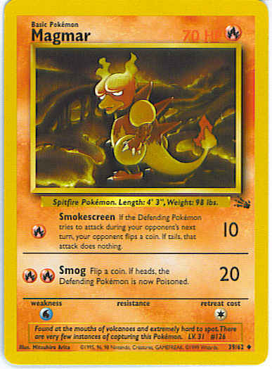 | Type | Fire | | Pokemon serie | Fossil | | Stadie | Basic | | HP | 70 | | Sjældenhed | Uncommon | | Tilbagetrækning | 1 | | Svaghed | W | | Kortnummer | 39 | | Evne |