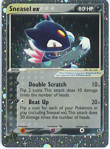 | Type | Darkness | | Pokemon serie | Ruby Sapphire | | Stadie | Basic | | HP | 80 | | Sjældenhed | Ultra-Rare | | Tilbagetrækning | 1 | | Modstand | P | | Svaghed | F | | Kortnummer | 103 | | Evne | [D] Double Scratch (10x) Flip 2 coins. This attack does 10 damage times the number of heads. [CDD] Beat Up (20x) Flip a coin for each of your Pokemon in play (including Sneasel ex). This attack does 20 damage times the number of heads.