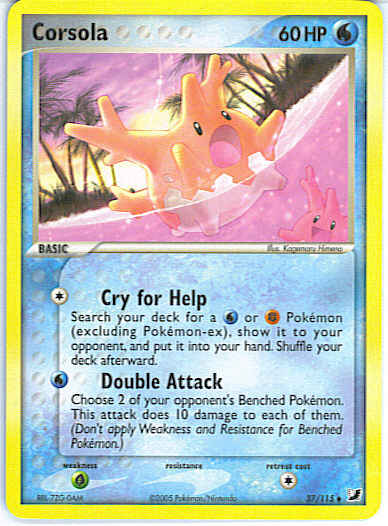 | Type | Water | | Pokemon serie | Unseen Forces | | Stadie | Basic | | HP | 60 | | Sjældenhed | Uncommon | | Tilbagetrækning | 1 | | Svaghed | G | | Kortnummer | 37 | | Evne | [C] Cry for Help - Search your deck for a W or F Pokemon (excluding Pokemon-ex), show it to your opponent, and put it into your hand. Shuffle your deck afterward. [W] Double Attack - Choose 2 of your opponent's Benched Pokemon. This attack does 10 damage to each of them. (Don't apply Weakness and Resistance for Benched Pokemon.) | | Evne2 | [C] Cry for Help - Search your deck for a W or F Pokemon (excluding Pokemon-ex), show it to your opponent, and put it into your hand. Shuffle your deck afterward. [W] Double Attack - Choose 2 of your opponent's Benched Pokemon. This attack does 10 damage to each of them. (Don't apply Weakness and Resistance for Benched Pokemon.) | | Kunstner | Kagemaru Himeno |