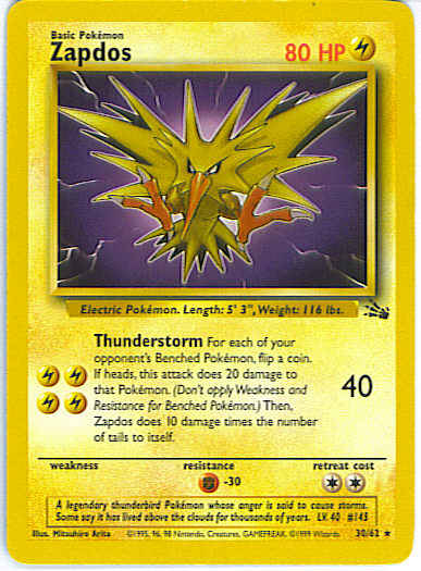 [LLLL] Thunderstorm (40) For each of your opponent's Benched Pokemon, flip a coin. If heads, this attack does 20 damage to that Pokemon. (Don't apply Weakness and Resistance for Benched Pokemon.) Then, Zapdos does 10 damage times the number of tails to itself.