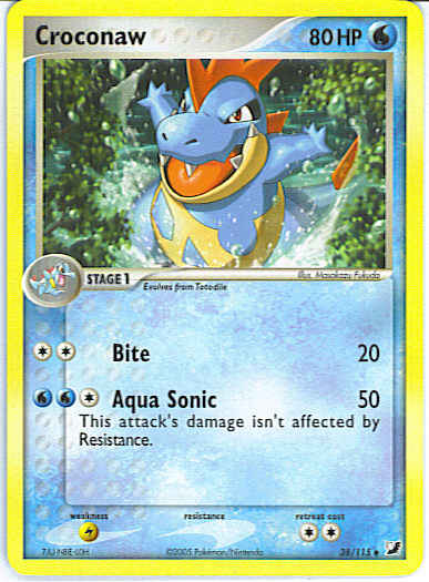 | Type | Water | | Pokemon serie | Unseen Forces | | Stadie | Stage 1 | | HP | 80 | | Sjældenhed | Uncommon | | Tilbagetrækning | 2 | | Svaghed | L | | Kortnummer | 38 | | Evne | [CC] Bite (20) [CWW] Aqua Sonic (50) This attack's damage isn't affected by Resistance. | | Evne2 | [CC] Bite (20) [CWW] Aqua Sonic (50) This attack's damage isn't affected by Resistance. | | Kunstner | Masakazu Fukuda |