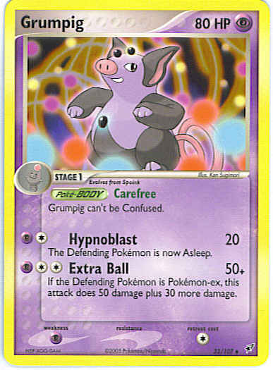 | Type | Psychic | | Pokemon serie | Deoxys | | Stadie | Stage 1 | | HP | 80 | | Sjældenhed | Uncommon | | Tilbagetrækning | 1 | | Svaghed | P | | Kortnummer | 32 | | Evne | [CP] Hypnoblast (20) The Defending Pokemon is now Asleep. [CCP] Extra Ball (50+) If the Defending Pokemon is Pokemon-ex, this attack does 50 damage plus 30 more damage. | | Evne2 | [CP] Hypnoblast (20) The Defending Pokemon is now Asleep. [CCP] Extra Ball (50+) If the Defending Pokemon is Pokemon-ex, this attack does 50 damage plus 30 more damage. | | Kunstner | Ken Sugimori |