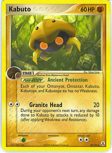| Type | Fighting | | Pokemon serie | Legend Maker | | Stadie | Stage 1 | | HP | 60 | | Sjældenhed | Uncommon | | Tilbagetrækning | 2 | | Svaghed | G | | Kortnummer | 36 | | Evne | [CC] Granite Head (20) During your opponent's next turn, any damage done to Kabuto by attacks is reduced by 10 (after applying Weakness and Resistance). | | Evne2 | [CC] Granite Head (20) During your opponent's next turn, any damage done to Kabuto by attacks is reduced by 10 (after applying Weakness and Resistance). | | Kunstner | Takao Unno |