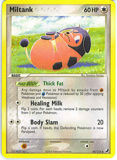 | Type | Colorless | | Pokemon serie | Unseen Forces | | Stadie | Basic | | HP | 60 | | Sjældenhed | Uncommon | | Tilbagetrækning | 1 | | Svaghed | F | | Kortnummer | 42 | | Evne | [C] Healing Milk - Flip 2 coins. For each heads, remove 2 damage counters from 1 of your Pokemon. [CC] Body Slam (20) Flip a coin. If heads, the Defending Pokemon is now Paralyzed. | | Evne2 | [C] Healing Milk - Flip 2 coins. For each heads, remove 2 damage counters from 1 of your Pokemon. [CC] Body Slam (20) Flip a coin. If heads, the Defending Pokemon is now Paralyzed. | | Kunstner | Tomokazu Komiya |