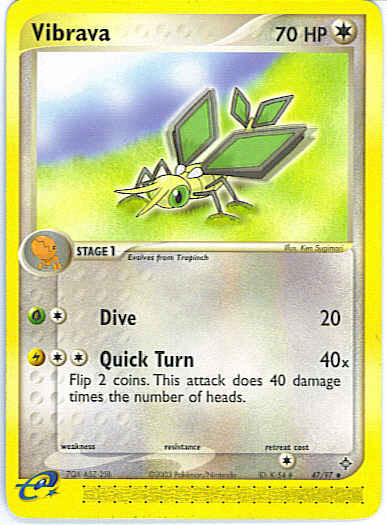 | Type | Colorless | | Pokemon serie | Dragon | | Stadie | Stage 1 | | HP | 70 | | Sjældenhed | Uncommon | | Tilbagetrækning | 1 | | Kortnummer | 47 | | Evne | [CG] Dive (20) [CCL] Quick Turn (40x) Flip 2 coins. This attack does 40 damage times the number of heads. | | Evne2 | [CG] Dive (20) [CCL] Quick Turn (40x) Flip 2 coins. This attack does 40 damage times the number of heads. | | Kunstner | Ken Sugimori |