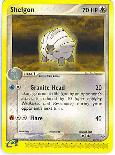 | Type | Colorless | | Pokemon serie | Dragon | | Stadie | Stage 1 | | HP | 70 | | Sjældenhed | Uncommon | | Tilbagetrækning | 2 | | Kortnummer | 42 | | Evne | [CW] Granite Head (20) Damage done to Shelgon by an opponent's attack is reduced by 10 (after applying Weakness and Resistance) during your opponent's next turn. [CCR] Flare (40) | | Evne2 | [CW] Granite Head (20) Damage done to Shelgon by an opponent's attack is reduced by 10 (after applying Weakness and Resistance) during your opponent's next turn. [CCR] Flare (40) | | Kunstner | Ken Sugimori |