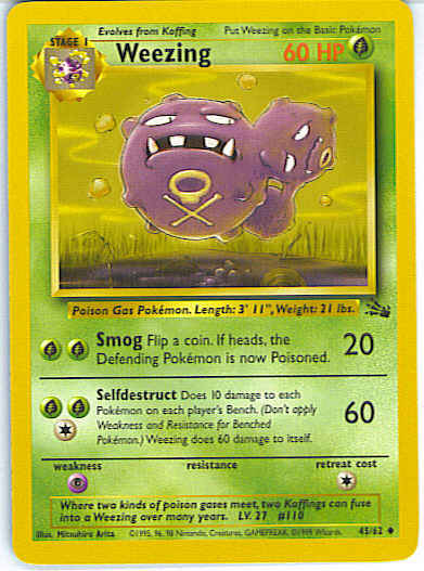 [CGG] Selfdestruct (60) Does 10 damage to each Pokemon on each player's Bench. (Don't apply Weakness and Resistance for Benched Pokemon.) Weezing does 60 damage to itself.