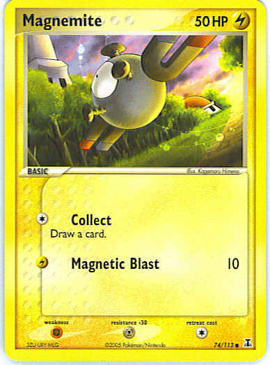 | Type | Lightning | | Pokemon serie | Delta Species | | Stadie | Basic | | HP | 50 | | Sjældenhed | Common | | Tilbagetrækning | 1 | | Modstand | M | | Svaghed | F | | Kortnummer | 74 | | Evne | [C] Collect - Draw a card. [L] Magnetic Blast (10) | | Evne2 | [C] Collect - Draw a card. [L] Magnetic Blast (10) | | Kunstner | Kagemaru Himeno |