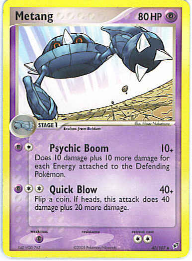 | Type | Psychic | | Pokemon serie | Deoxys | | Stadie | Stage 1 | | HP | 80 | | Sjældenhed | Uncommon | | Tilbagetrækning | 2 | | Svaghed | P | | Kortnummer | 40 | | Evne | [CP] Psychic Boom (10+) Does 10 damage plus 10 more damage for each Energy attached to the Defending Pokemon. [CCP] Quick Blow (40+) Flip a coin. If heads, this attack does 40 damage plus 20 more damage. | | Evne2 | [CP] Psychic Boom (10+) Does 10 damage plus 10 more damage for each Energy attached to the Defending Pokemon. [CCP] Quick Blow (40+) Flip a coin. If heads, this attack does 40 damage plus 20 more damage. | | Kunstner | Hisao Nakamura |