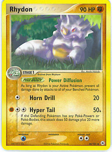 | Type | Fighting | | Pokemon serie | Hidden Legends | | Stadie | Stage 1 | | HP | 90 | | Sjældenhed | Uncommon | | Tilbagetrækning | 2 | | Svaghed | W | | Kortnummer | 46 | | Evne | [C] Horn Drill (20) [CCF] Hyper Tail (50+) If the Defending Pokemon has any Poke-Powers or Poke-Bodies, this attack does 50 damage plus 20 more damage. | | Evne2 | [C] Horn Drill (20) [CCF] Hyper Tail (50+) If the Defending Pokemon has any Poke-Powers or Poke-Bodies, this attack does 50 damage plus 20 more damage. | | Kunstner | Atsuko Nishida |