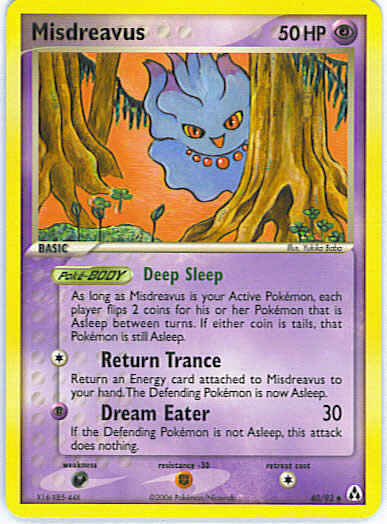 | Type | Psychic | | Pokemon serie | Legend Maker | | Stadie | Basic | | HP | 50 | | Sjældenhed | Uncommon | | Tilbagetrækning | 1 | | Modstand | F | | Svaghed | D | | Kortnummer | 40 | | Evne | [C] Return Trance - Return an Energy card attached to Misdreavus to your hand. The Defending Pokemon is now Asleep. [P] Dream Eater (30) If the Defending Pokemon is not Asleep, this attack does nothing. | | Evne2 | [C] Return Trance - Return an Energy card attached to Misdreavus to your hand. The Defending Pokemon is now Asleep. [P] Dream Eater (30) If the Defending Pokemon is not Asleep, this attack does nothing. | | Kunstner | Yukiko Baba |