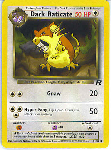| Type | Colorless | | Pokemon serie | Team Rocket | | Stadie | Stage 1 | | HP | 50 | | Sjældenhed | Common | | Tilbagetrækning | 1 | | Modstand | P | | Svaghed | F | | Kortnummer | 51 | | Evne |