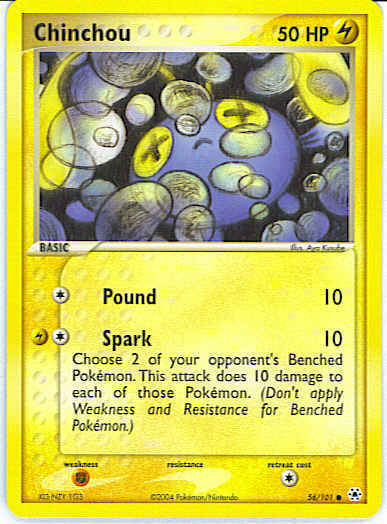 | Type | Lightning | | Pokemon serie | Hidden Legends | | Stadie | Basic | | HP | 50 | | Sjældenhed | Common | | Tilbagetrækning | 1 | | Svaghed | F | | Kortnummer | 56 | | Evne | [C] Pound (10) [CL] Spark (10) Choose 2 of your opponent's Benched Pokemon. This attack does 10 damage to each of those Pokemon. (Don't apply Weakness and Resistance for Benched Pokemon.) | | Evne2 | [C] Pound (10) [CL] Spark (10) Choose 2 of your opponent's Benched Pokemon. This attack does 10 damage to each of those Pokemon. (Don't apply Weakness and Resistance for Benched Pokemon.) | | Kunstner | Aya Kusube |