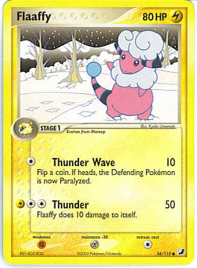 | Type | Lightning | | Pokemon serie | Unseen Forces | | Stadie | Stage 1 | | HP | 80 | | Sjældenhed | Common | | Tilbagetrækning | 1 | | Modstand | M | | Svaghed | F | | Kortnummer | 56 | | Evne | [C] Thunder Wave (10) Flip a coin. If heads, the Defending Pokemon is now Paralyzed. [CCL] Thunder (50) Flaaffy does 10 damage to itself. | | Evne2 | [C] Thunder Wave (10) Flip a coin. If heads, the Defending Pokemon is now Paralyzed. [CCL] Thunder (50) Flaaffy does 10 damage to itself. | | Kunstner | Kyoko Umemoto |