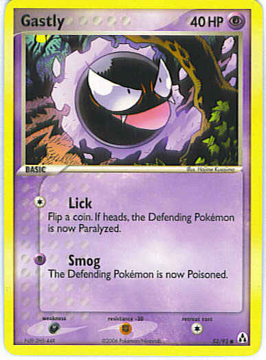 | Type | Psychic | | Pokemon serie | Legend Maker | | Stadie | Basic | | HP | 40 | | Sjældenhed | Common | | Tilbagetrækning | 1 | | Modstand | F | | Svaghed | D | | Kortnummer | 52 | | Evne | [C] Lick - Flip a coin. If heads, the Defending Pokemon is now Paralyzed. [P] Smog - The Defending Pokemon is now Poisoned. | | Evne2 | [C] Lick - Flip a coin. If heads, the Defending Pokemon is now Paralyzed. [P] Smog - The Defending Pokemon is now Poisoned. | | Kunstner | Hajime Kusajima |