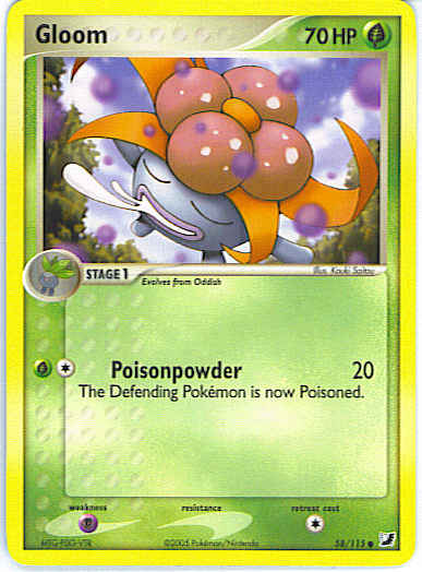 | Type | Grass | | Pokemon serie | Unseen Forces | | Stadie | Stage 1 | | HP | 70 | | Sjældenhed | Common | | Tilbagetrækning | 1 | | Svaghed | P | | Kortnummer | 58 | | Evne | [CG] Poisonpowder (20) The Defending Pokemon is now Poisoned. | | Evne2 | [CG] Poisonpowder (20) The Defending Pokemon is now Poisoned. | | Kunstner | Kouki Saitou |