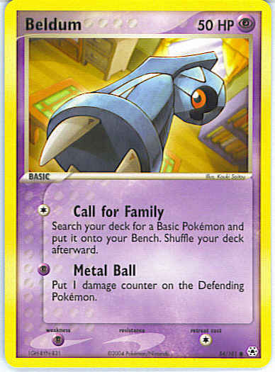| Type | Psychic | | Pokemon serie | Hidden Legends | | Stadie | Basic | | HP | 50 | | Sjældenhed | Common | | Tilbagetrækning | 1 | | Svaghed | P | | Kortnummer | 54 | | Evne | [C] Call for Family - Search your deck for a Basic Pokemon and put it onto your Bench. Shuffle your deck afterward. [P] Metal Ball - Put 1 damage counter on the Defending Pokemon. | | Evne2 | [C] Call for Family - Search your deck for a Basic Pokemon and put it onto your Bench. Shuffle your deck afterward. [P] Metal Ball - Put 1 damage counter on the Defending Pokemon. | | Kunstner | Kouki Saitou |