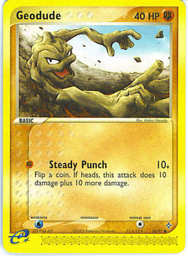 | Type | Fighting | | Pokemon serie | Dragon | | Stadie | Basic | | HP | 40 | | Sjældenhed | Common | | Tilbagetrækning | 1 | | Svaghed | W | | Kortnummer | 56 | | Evne | [F] Steady Punch (10+) Flip a coin. If heads, this attack does 10 damage plus 10 more damage. | | Evne2 | [F] Steady Punch (10+) Flip a coin. If heads, this attack does 10 damage plus 10 more damage. | | Kunstner | Midori Harada |