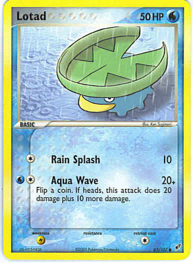| Type | Water | | Pokemon serie | Deoxys | | Stadie | Basic | | HP | 50 | | Sjældenhed | Common | | Tilbagetrækning | 1 | | Svaghed | L | | Kortnummer | 63 | | Evne | [C] Rain Splash (10) [CW] Aqua Wave (20+) Flip a coin. If heads, this attack does 20 damage plus 10 more damage. | | Evne2 | [C] Rain Splash (10) [CW] Aqua Wave (20+) Flip a coin. If heads, this attack does 20 damage plus 10 more damage. | | Kunstner | Ken Sugimori |