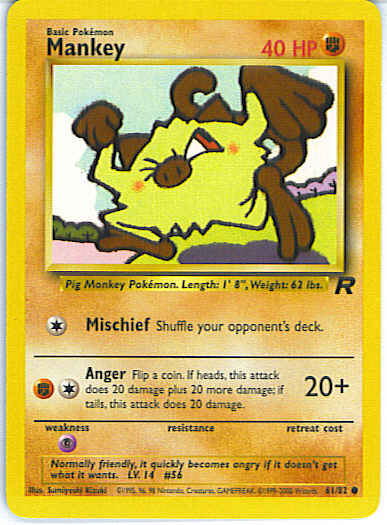 | Type | Fighting | | Pokemon serie | Team Rocket | | Stadie | Basic | | HP | 40 | | Sjældenhed | Common | | Svaghed | P | | Kortnummer | 61 | | Evne |