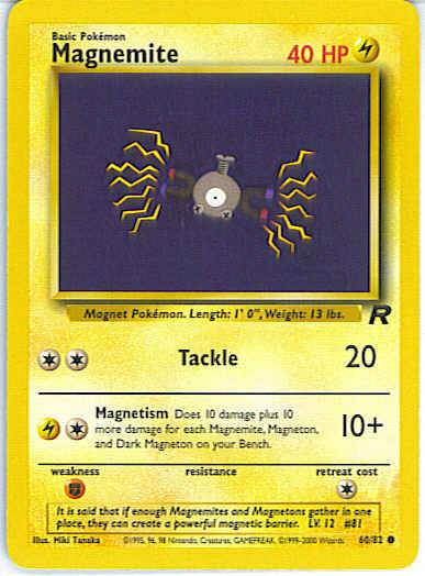 | Type | Lightning | | Pokemon serie | Team Rocket | | Stadie | Basic | | HP | 40 | | Sjældenhed | Common | | Tilbagetrækning | 1 | | Svaghed | F | | Kortnummer | 60 | | Evne |