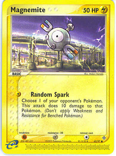 | Type | Lightning | | Pokemon serie | Dragon | | Stadie | Basic | | HP | 50 | | Sjældenhed | Common | | Tilbagetrækning | 1 | | Modstand | M | | Svaghed | F | | Kortnummer | 62 | | Evne | [L] Random Spark - Choose 1 of your opponent's Pokemon. This attack does 10 damage to that Pokemon. (Don't apply Weakness and Resistance for Benched Pokemon.) | | Evne2 | [L] Random Spark - Choose 1 of your opponent's Pokemon. This attack does 10 damage to that Pokemon. (Don't apply Weakness and Resistance for Benched Pokemon.) | | Kunstner | Midori Harada |