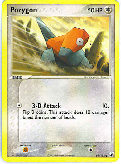 | Type | Colorless | | Pokemon serie | Unseen Forces | | Stadie | Basic | | HP | 50 | | Sjældenhed | Common | | Tilbagetrækning | 1 | | Svaghed | F | | Kortnummer | 69 | | Evne | [C] 3-D Attack (10x) Flip 3 coins. This attack does 10 damage times the number of heads. | | Evne2 | [C] 3-D Attack (10x) Flip 3 coins. This attack does 10 damage times the number of heads. | | Kunstner | Kagemaru Himeno |