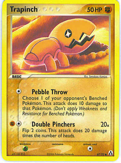 | Type | Fighting | | Pokemon serie | Legend Maker | | Stadie | Basic | | HP | 50 | | Sjældenhed | Common | | Tilbagetrækning | 1 | | Svaghed | G | | Kortnummer | 67 | | Evne | [C] Pebble Throw - Choose 1 of your opponent's Benched Pokemon. This attack does 10 damage to that Pokemon. (Don't apply Weakness and Resistance for Benched Pokemon.) [CF] Double Pinchers (20x) Flip 2 coins. This attack does 2 damage times the number of heads. | | Evne2 | [C] Pebble Throw - Choose 1 of your opponent's Benched Pokemon. This attack does 10 damage to that Pokemon. (Don't apply Weakness and Resistance for Benched Pokemon.) [CF] Double Pinchers (20x) Flip 2 coins. This attack does 2 damage times the number of heads. | | Kunstner | Tomokazu Komiya |