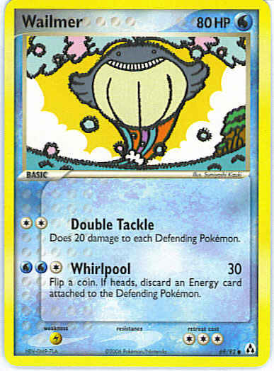 | Type | Water | | Pokemon serie | Legend Maker | | Stadie | Basic | | HP | 80 | | Sjældenhed | Common | | Tilbagetrækning | 3 | | Svaghed | L | | Kortnummer | 69 | | Evne | [CC] Double Tackle - Does 20 damage to each Defending Pokemon. [CWW] Whirlpool (30) Flip a coin. If heads, discard an Energy card attached to the Defending Pokemon. | | Evne2 | [CC] Double Tackle - Does 20 damage to each Defending Pokemon. [CWW] Whirlpool (30) Flip a coin. If heads, discard an Energy card attached to the Defending Pokemon. | | Kunstner | Sumiyoshi Kizuki |