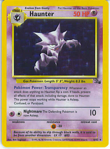 | Type | Psychic | | Pokemon serie | Fossil | | Stadie | Stage 1 | | HP | 50 | | Sjældenhed | Rare | | Modstand | F | | Kortnummer | 6 | | Evne | of that attack, including damage, done to Haunter. This power stops working while Haunter is Asleep.