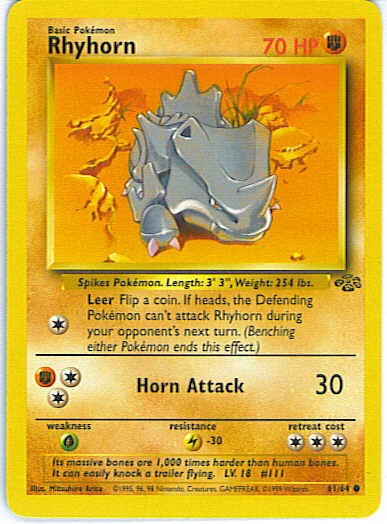 [C] Leer - Flip a coin. If heads, the Defending Pokemon can't attack Rhyhorn during your opponent's next turn. (Benching either Pokemon ends this effect.)