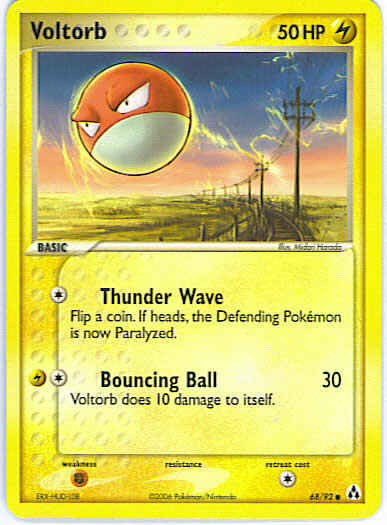 | Type | Lightning | | Pokemon serie | Legend Maker | | Stadie | Basic | | HP | 50 | | Sjældenhed | Common | | Tilbagetrækning | 1 | | Svaghed | F | | Kortnummer | 68 | | Evne | [C] Thunder Wave - Flip a coin. If the Defending Pokemon is now Paralyzed. [CL] Bouncing Ball (30) Voltorb does 10 damage to itself. | | Evne2 | [C] Thunder Wave - Flip a coin. If the Defending Pokemon is now Paralyzed. [CL] Bouncing Ball (30) Voltorb does 10 damage to itself. | | Kunstner | Midori Harada |