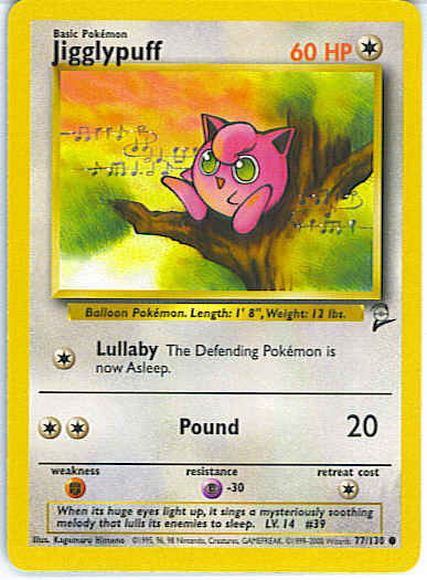 | Type | Colorless | | Pokemon serie | Base Set 2 | | Stadie | Basic | | HP | 60 | | Sjældenhed | Common | | Tilbagetrækning | 1 | | Modstand | P | | Svaghed | F | | Kortnummer | 77 | | Evne |