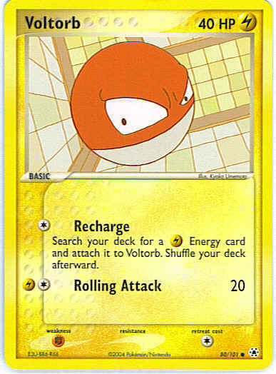 | Type | Lightning | | Pokemon serie | Hidden Legends | | Stadie | Basic | | HP | 40 | | Sjældenhed | Common | | Tilbagetrækning | 1 | | Svaghed | F | | Kortnummer | 80 | | Evne | [C] Recharge - Search your deck for a L Energy card and attach it to Voltorb. Shuffle your deck afterward. [CL] Rolling Attack (20) | | Evne2 | [C] Recharge - Search your deck for a L Energy card and attach it to Voltorb. Shuffle your deck afterward. [CL] Rolling Attack (20) | | Kunstner | Kyoko Umemoto |